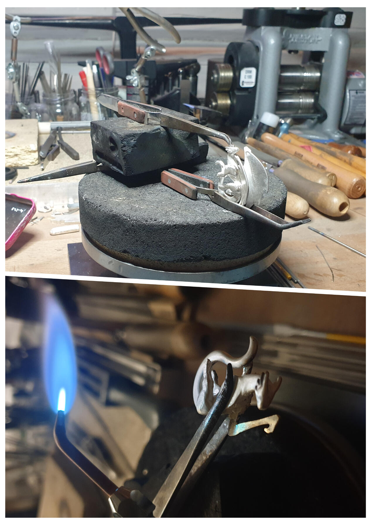 The most risky and difficult but also most enjoyable part of the process is the soldering.The basics of it is that you have multiple objects, usually two at a time, that you heat fuse together using a metal that has a slightly lower melting point (the solder). Flux protects the surfaces from contamination.I usually place the solder on to the objects as it's 50~ or so celsius from melting. It's a very intuitive skill and takes a lot of practice to understand when and how it flows.The melting point of sterling 925 silver is 893c. The solder (hard) has to be 788c to flow properly. If you burn a little to hard you risk destroying the whole thing. It's easy to mess up the surface if you're not super careful since it starts to deform as it approaches the melting point.